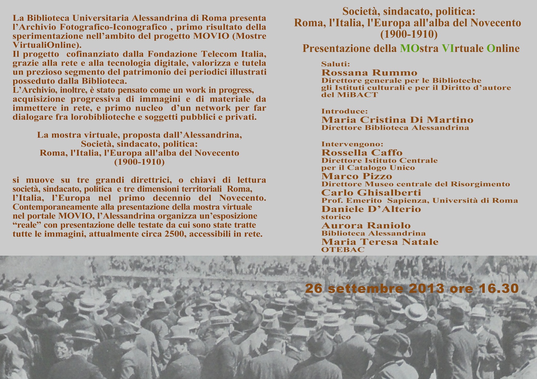 La mostra virtuale, proposta dall’Alessandrina, si muove su tre grandi direttrici, o chiavi di lettura - società, sindacato, politica - , in costante interazione tra loro, e tre dimensioni territoriali – Roma, l’Italia, l’Europa – privilegiate in un continuo gioco d’assonanze, discrepanze e connessioni