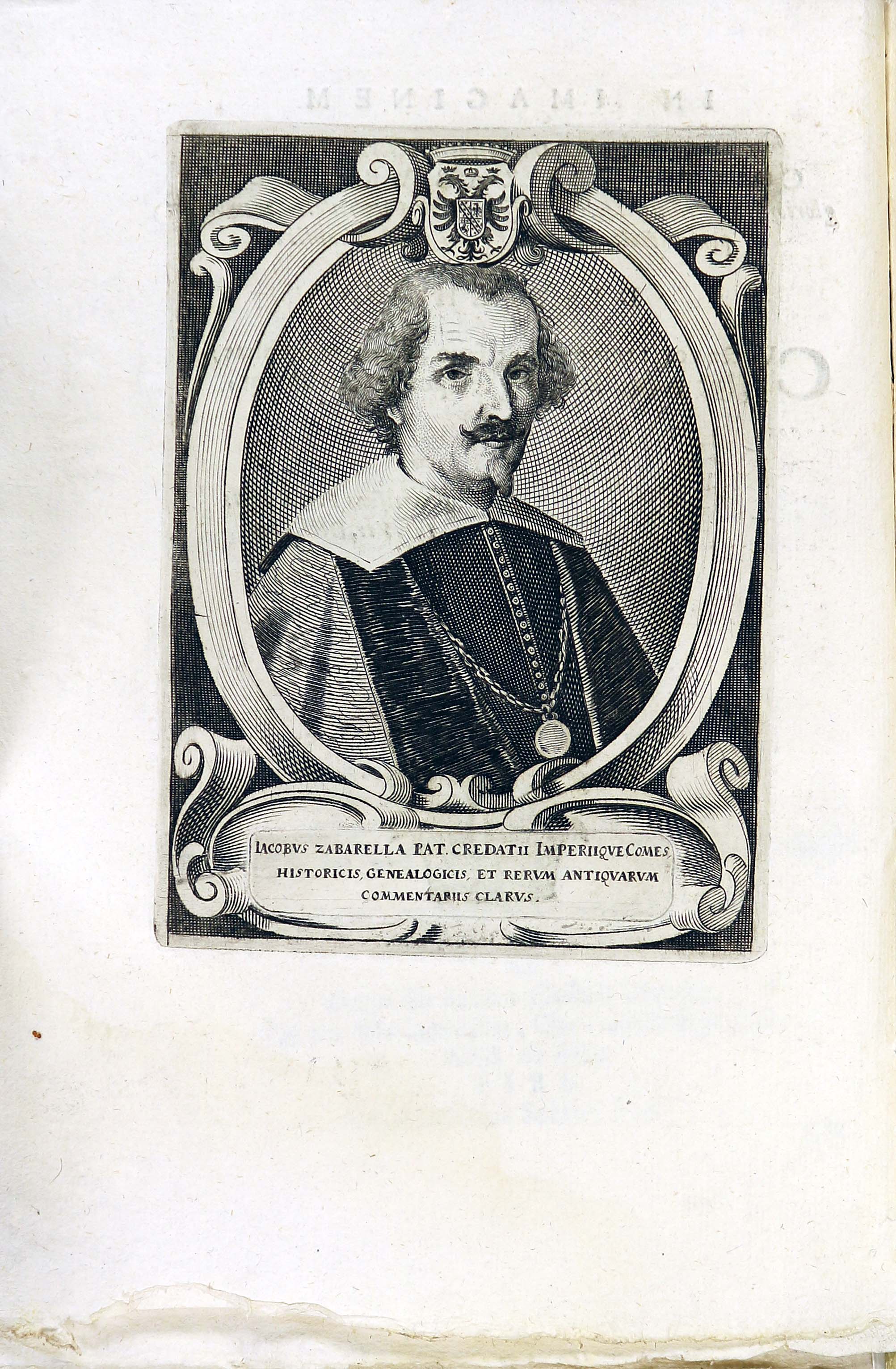 In alto una figura femminile ammantata e seduta tiene nella mano sinistra un libro aperto su cui si leggono le parole “Magistra vitae” in riferimento al noto verso ciceroniano “Historia vero testis temporum, lux veritatis, vita memoriae, magistra vitae, nuntia vetustatis” ("la storia è testimone dei tempi, luce di verità, vita della memoria, maestra di vita, messaggera del passato": De oratore, II, 36) e all’argomento trattato dallo Zabarella; ai suoi lati due putti reggono un drappo nel quale si legge il titolo dell’opera.